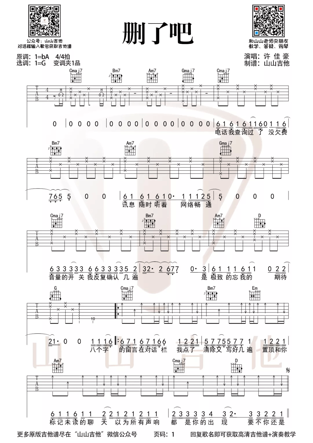 《删了吧》是一首吉他弹唱版的完整歌曲,由烟(许佳豪)演唱。这首歌以网络情感社交为背景,生动地描绘了恋人之间的爱恨分离,引起了人们的强烈共鸣。歌词中的一句“删了吧”代表着一段关系的结束,也许随之而来的许多后续事情就此彻底终结。整首歌曲采用总谱形式,调性降调,适合使用夹一品的方式进行吉他弹唱。