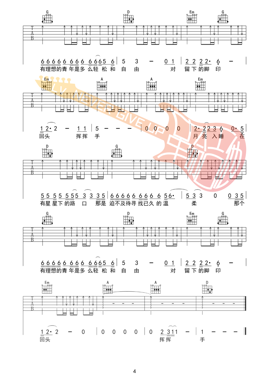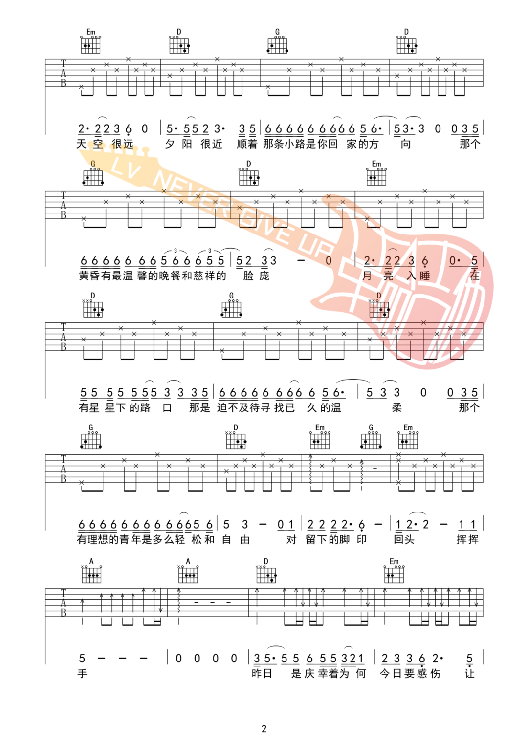 《背影》是一首耐人回味的吉他弹唱曲目。使用C调降半音调弦,我们提供了两张高清图片谱供学习和分享。这首歌以其质朴自然的演唱风格和如诗般的歌词而闻名,旋律简单而纯粹。歌声深情动人,吉他的伴奏让人感受到一把自由自在的旅行。《背影》以其真挚的情感触动人心,如同一把悠扬的吉他带领我们走向未知的天涯。人生的道路还很长,当我们面临离别的时候,我们要以美丽的背影告别。这首歌诉说着深刻的离别和别离的情感,唤起人们对珍贵时刻的回忆和感慨。让我们一起学习演奏《背影》,以美妙的音乐表达内心的情感。