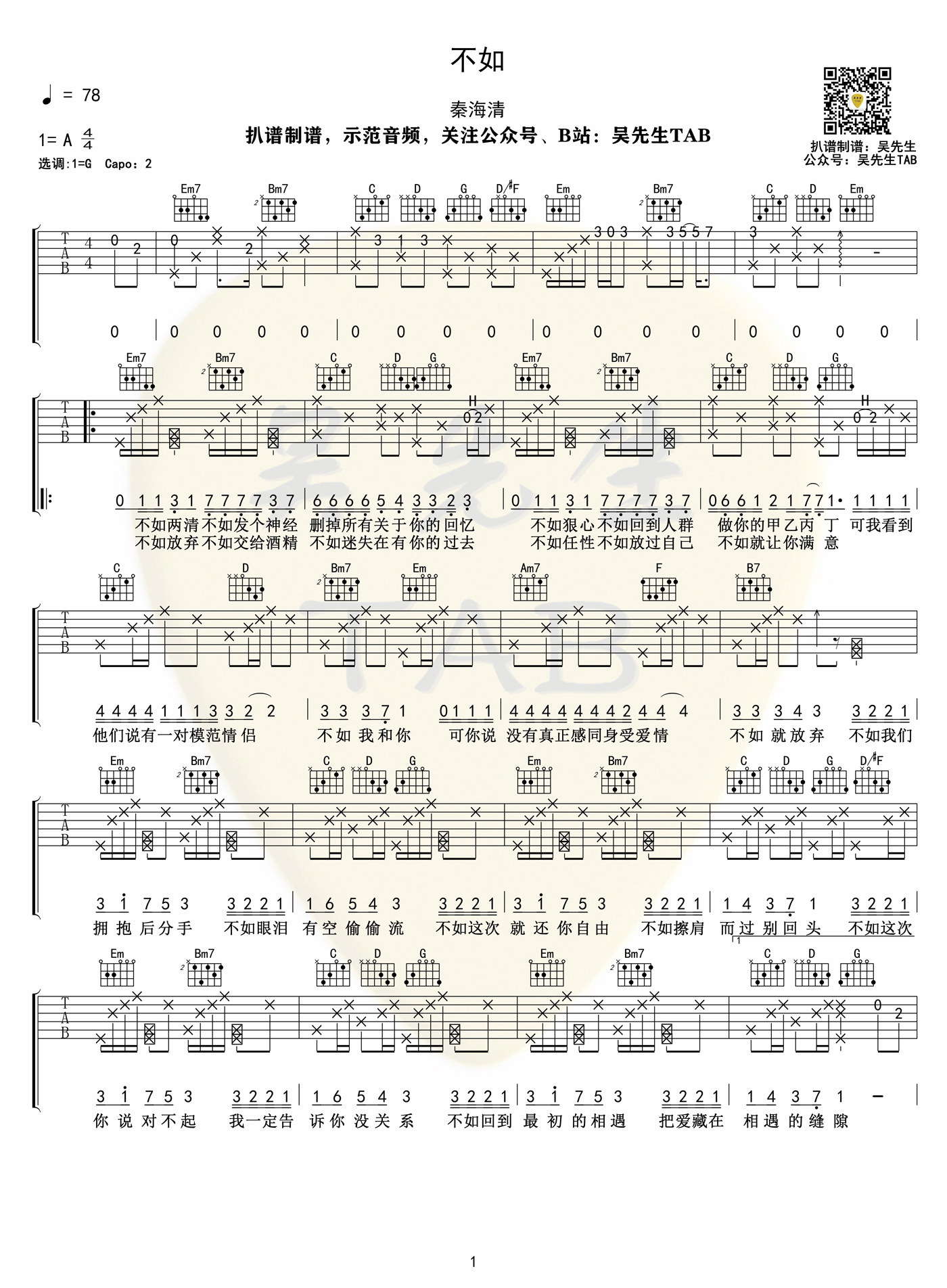 《不如》是一首秦海清创作的网络热门歌曲,它在歌迷中广受欢迎。这首歌的吉他编曲简单易学,即使你不熟悉大横按的弹奏技巧,也可以轻松地演唱。