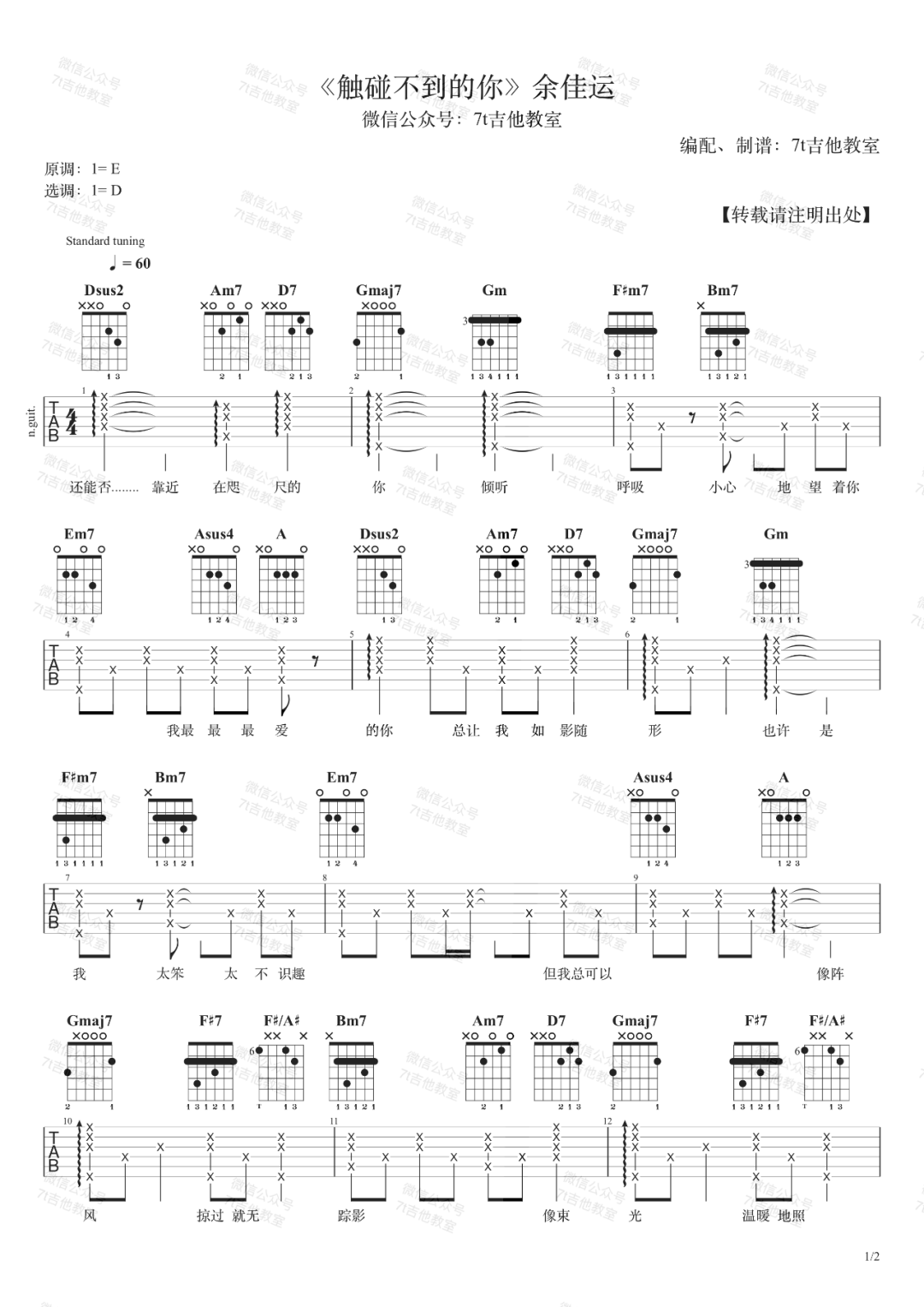 《触碰不到的你》是一首动人的歌曲,它以E大调创作,但我使用了D大调演奏。如果你想弹奏这首歌,只需夹变调夹到第2品即可。在这里,我分享了《触碰不到的你》的吉他谱例,希望对你有所帮助。