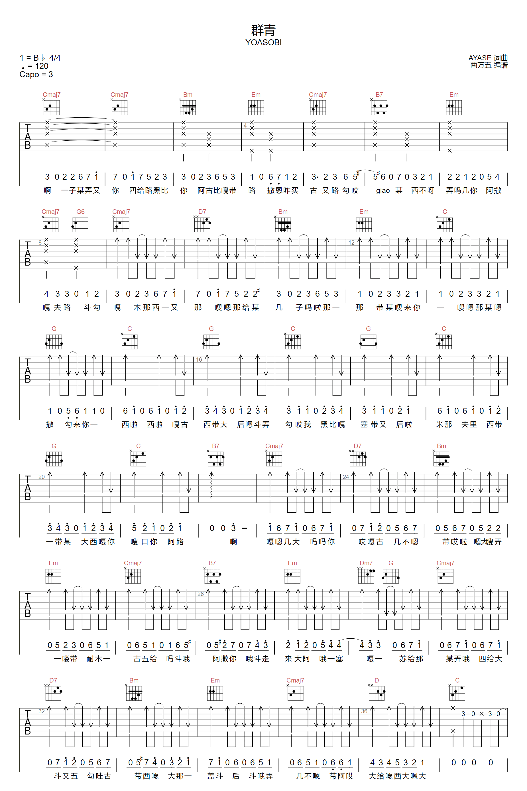 《群青》的吉他弹唱谱制作精良,选用了总谱,并推荐使用变调夹夹3品。曲谱还原度很高,同时还包含一些拍弦技巧的应用,对于对此感兴趣的朋友来说,可以尝试一下。