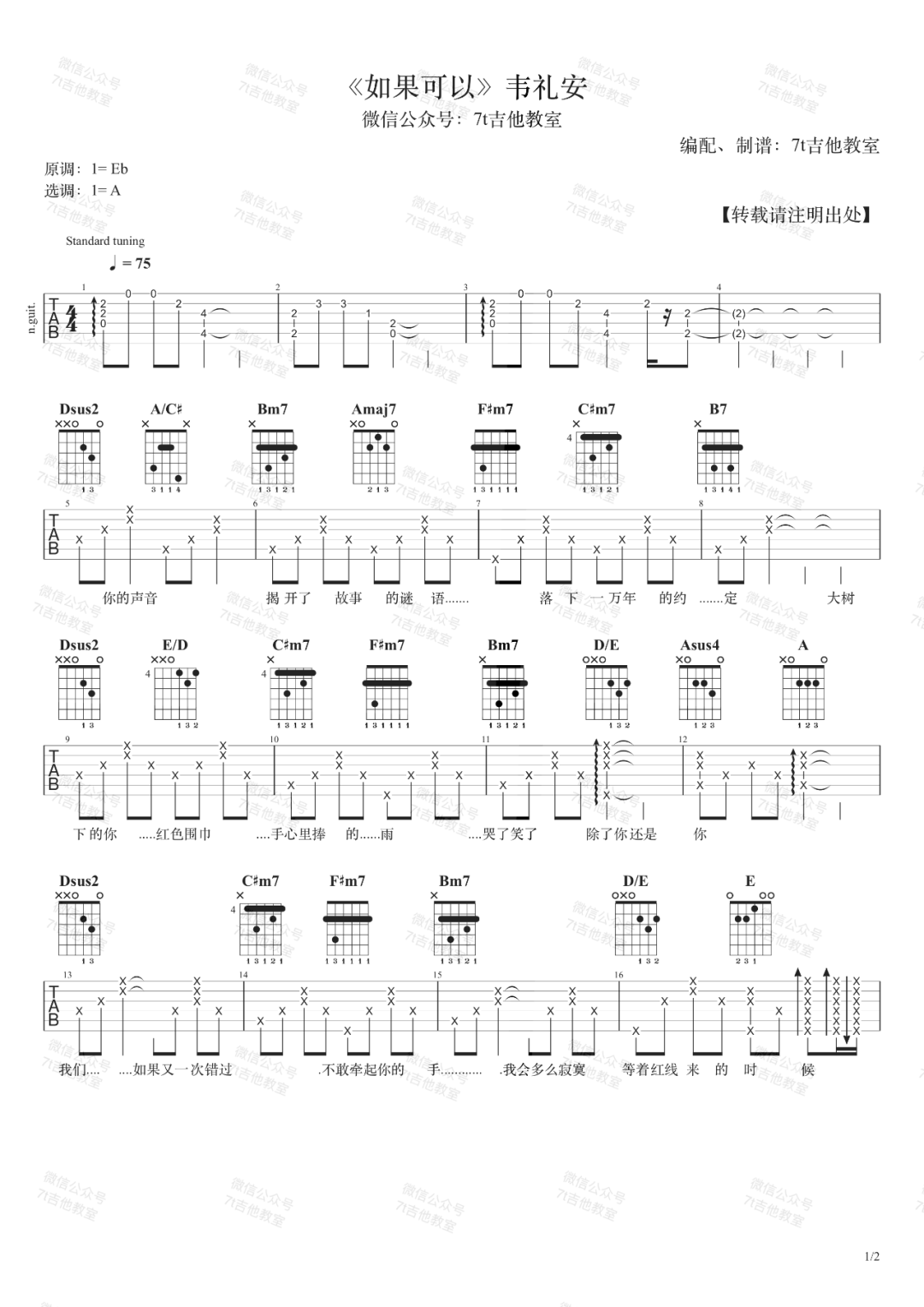 《如果可以》是一首由韦礼安演唱的歌曲。这里提供了适合吉他弹唱的谱子。建议在弹唱时使用1品变调夹,速度为85BPM,节奏为4/4拍。这首歌的难度较为简单,适合初学者上手练习。谱子提供了完整的指法和节奏示意,方便学习和演奏。《如果可以》通过温暖的旋律和歌词,表达了对美好事物的向往和期盼。它带给人们一种憧憬和希望的情感,让人们思考如果有机会改变现状,会选择怎样的未来。这首歌曲旋律简单易记,既能让人放松心情,又能引发共鸣。无论你是喜欢弹唱吉他还是享受音乐的人,这首歌都能给你带来愉悦和满足的音乐体验。快拿起吉他,跟着谱子一起演奏吧!