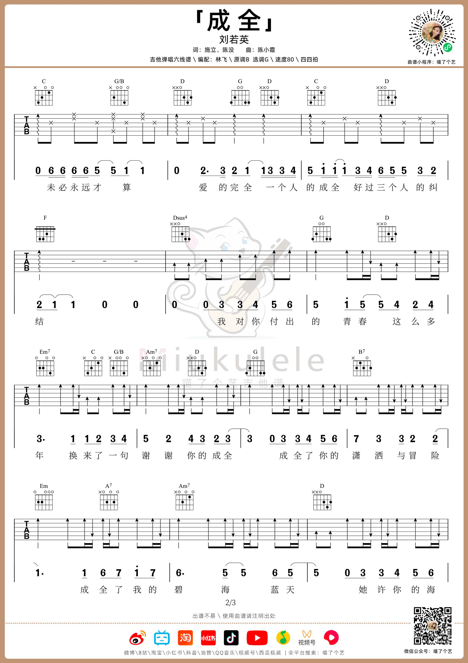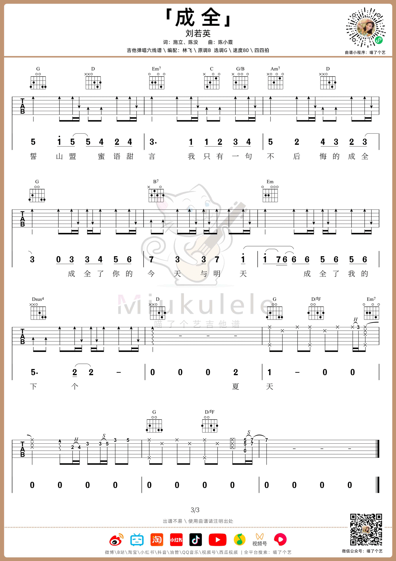 不论你是刚刚开始学习吉他的初学者,还是已经具备一定弹唱经验的爱好者,都可以通过尝试演奏《成全》来提升自己的技巧和表现能力。让我们一起享受这首简单而动人的歌曲带来的音乐旅程吧!