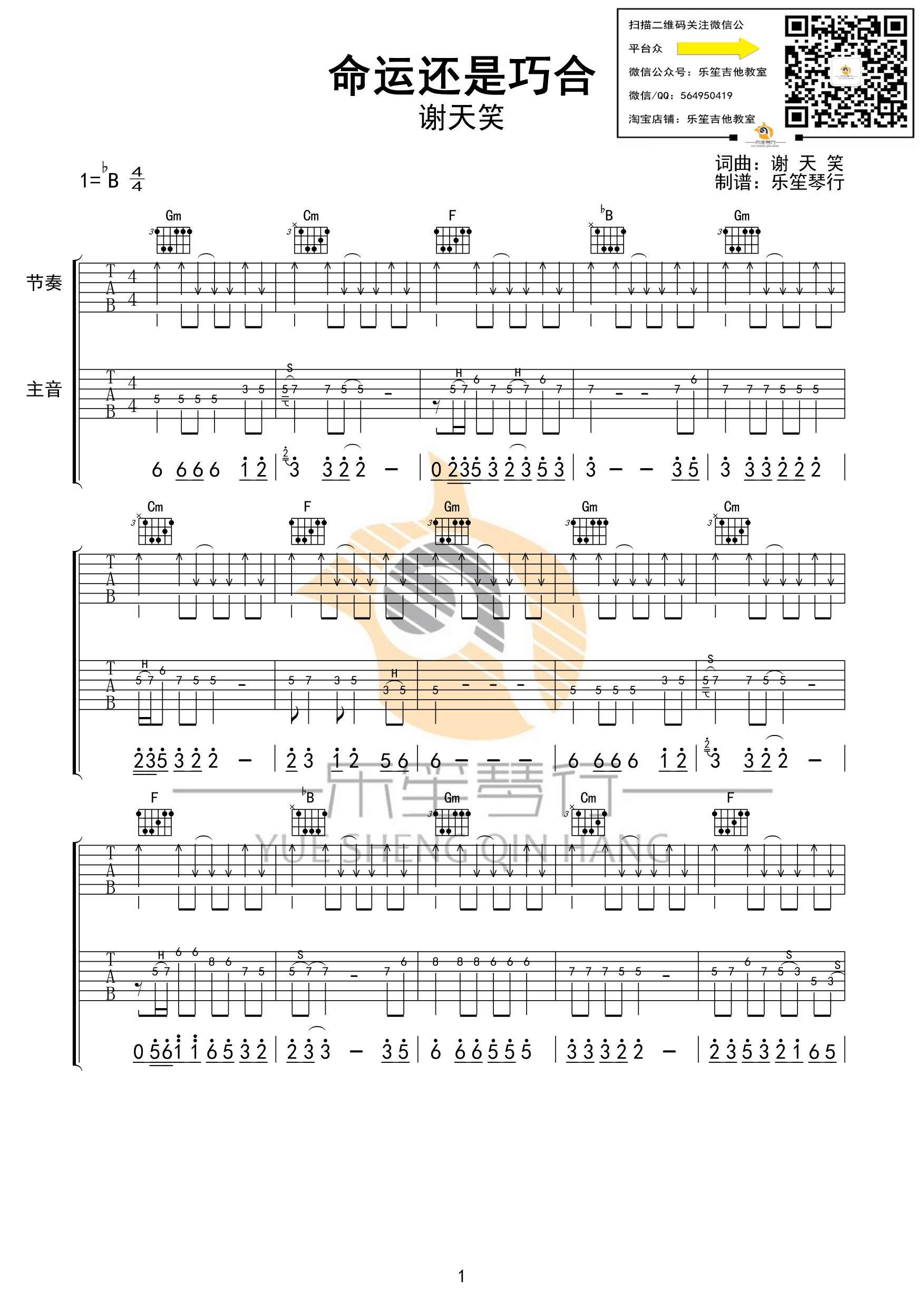 命运还是巧合吉他谱_降B调_谢天笑