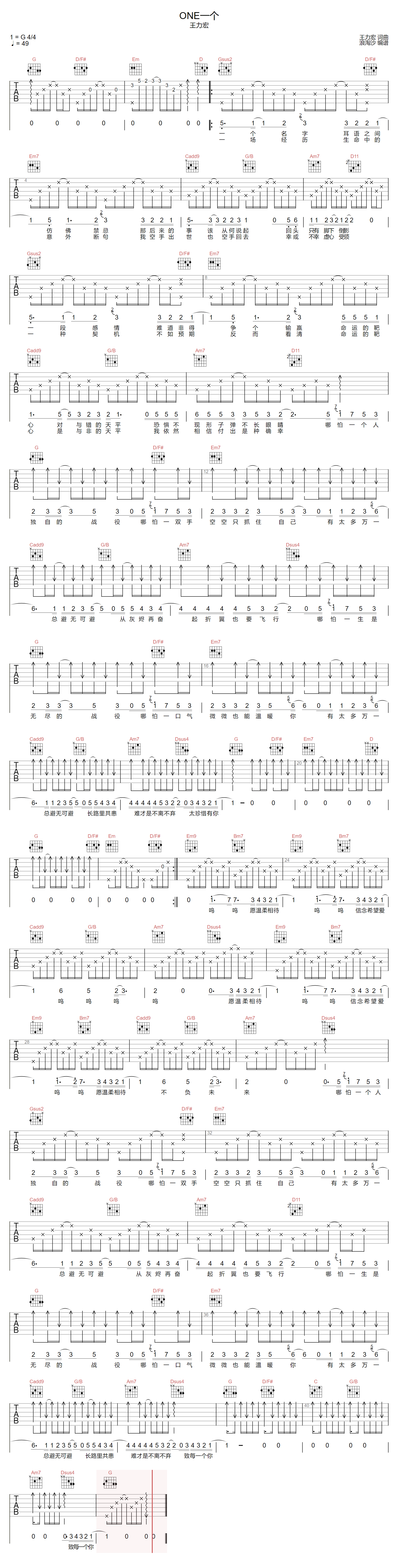 one一个吉他谱_G调_王力宏